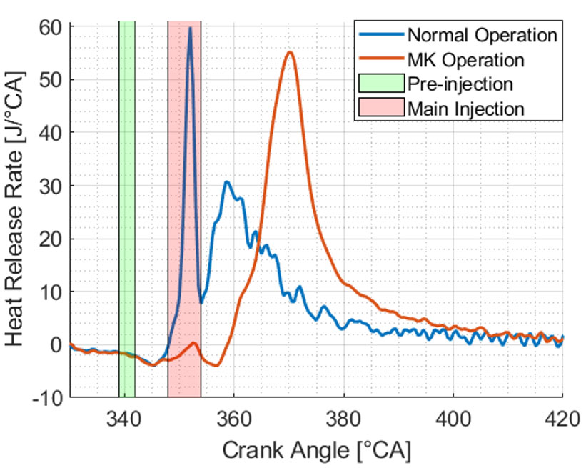 Erre az alacsony hőmérsékletű égésfolyamatok (LTC) kitűnő megoldást nyújtanak, hiszen alkalmazásukkal egyidejűleg csökkenthető a kompressziógyújtású motorok nitrogén-oxid és korom emissziója, valamint a hatásfok is növelhető. Ugyanakkor az ilyen instabil égésfolyamatok irányítása nehéz, emiatt a piaci alkalmazások esetén elengedhetetlen a modell prediktív vezérlők (MPC) használata, melyek ciklusról ciklusra irányíthatják az égésfolyamatot. A hagyományos fizikai modellek helyett a mesterséges intelligencia (AI) alapú modellek hatékonyabbak lehetnek egyszerűségük miatt, ezért az MPC készítése során is érdemes lehet erre támaszkodni. Ebben a cikkben mesterséges intelligencia alapú modellek kerülnek bemutatásra, melyek képesek az égésfolyamat legfontosabb paramétereit előrejelezni normál dízel illetve LTC üzem során. A létrehozott LTC folyamat modulált kinetika (MK) típusú, mely nagyarányú kipufogógáz visszavezetést (EGR) alkalmaz. A modellek így 113 különböző szívóoldali oxigénkoncentráció mellett lettek betanítva és validálva, hogy az EGR hatása megfelelően modellezésre kerüljön. Az eredmények azt mutatják, hogy a modellek pontosak, így a jövőbeni kutatások során ezek felhasználásával lehetséges egy MPC implementálása.